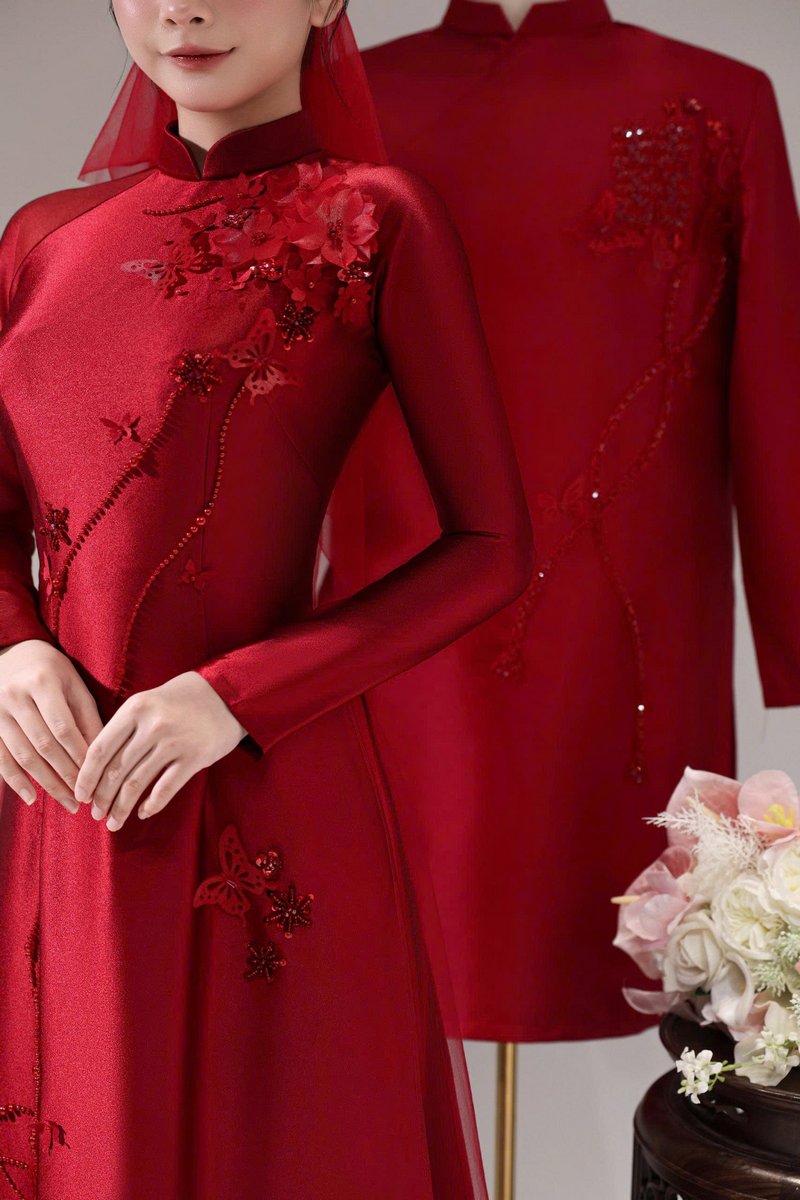 Áo dài cô dâu đỏ đô kết hoa bướm – DD101