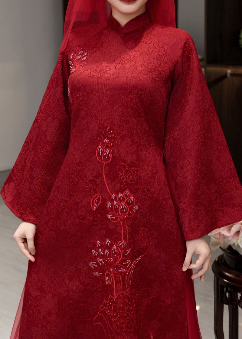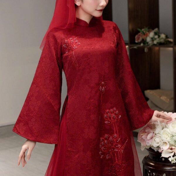 Áo dài cô dâu đỏ đô gấm suông hoa sen