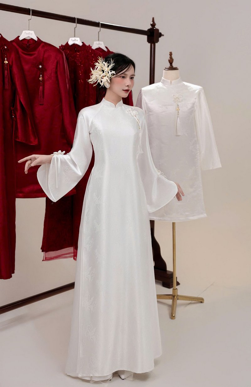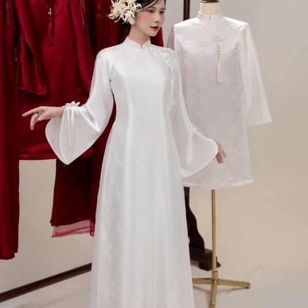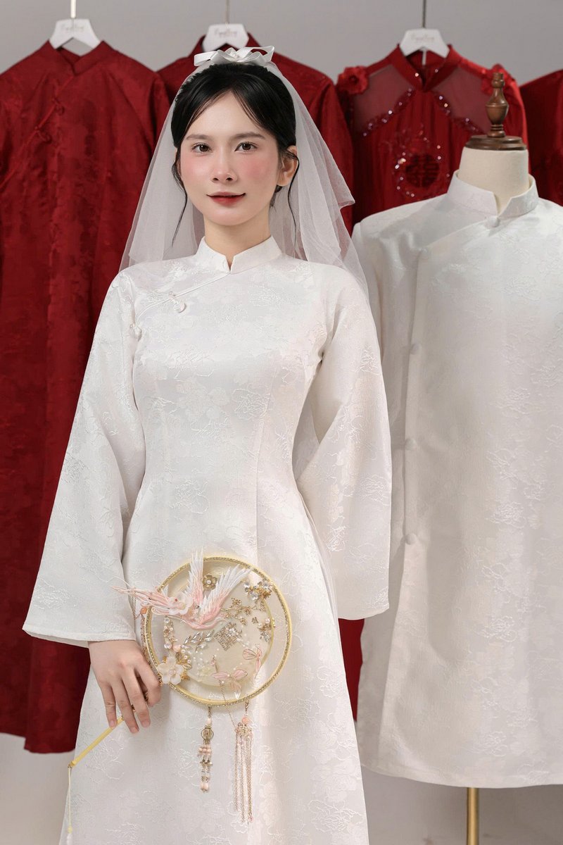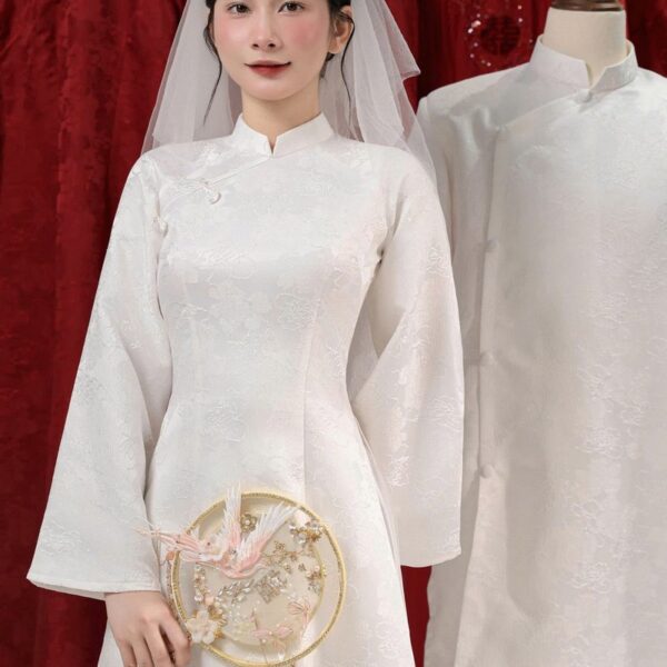 Áo dài cô dâu trắng gấm trơn hoa – TG82