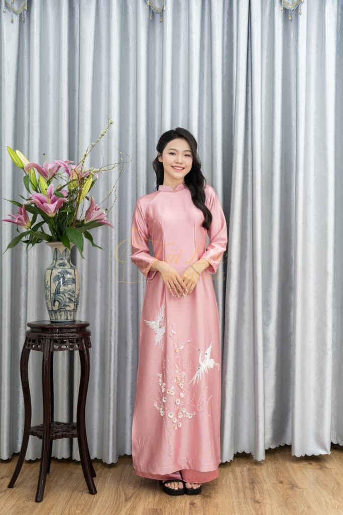 Áo dài bà sui hồng lụa Ruby thêu đính đá cao cấp- H364
