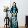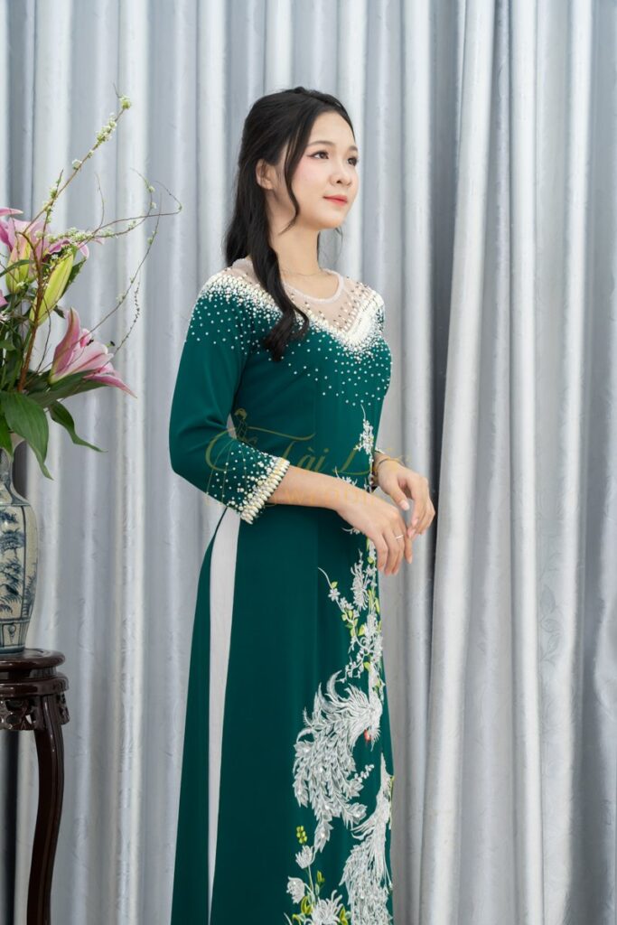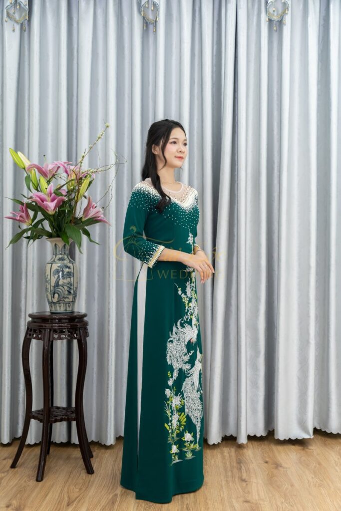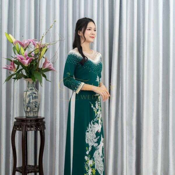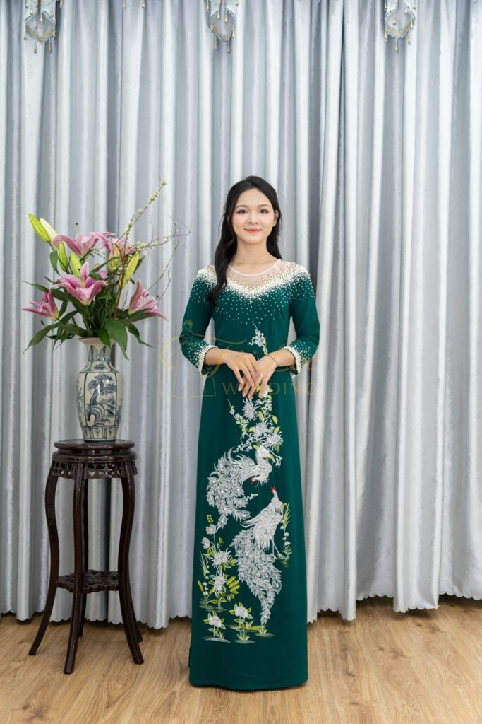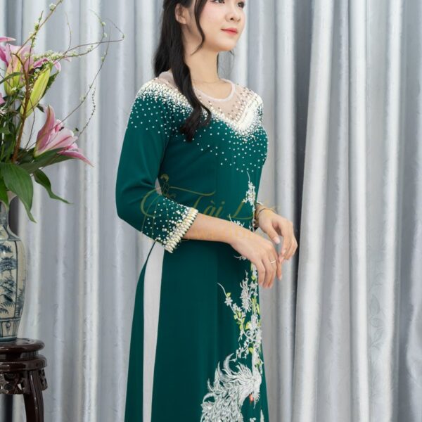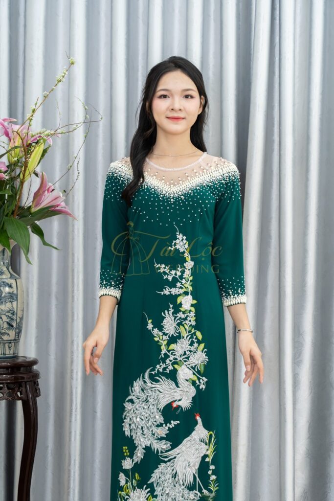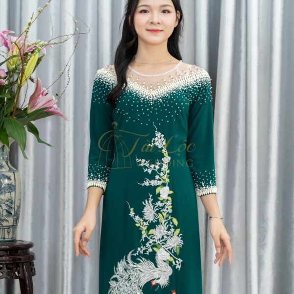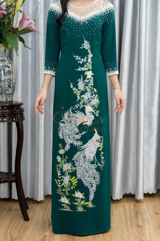 Áo dài bà sui xanh lụa Mango thêu Chim Công cao cấp- X347
