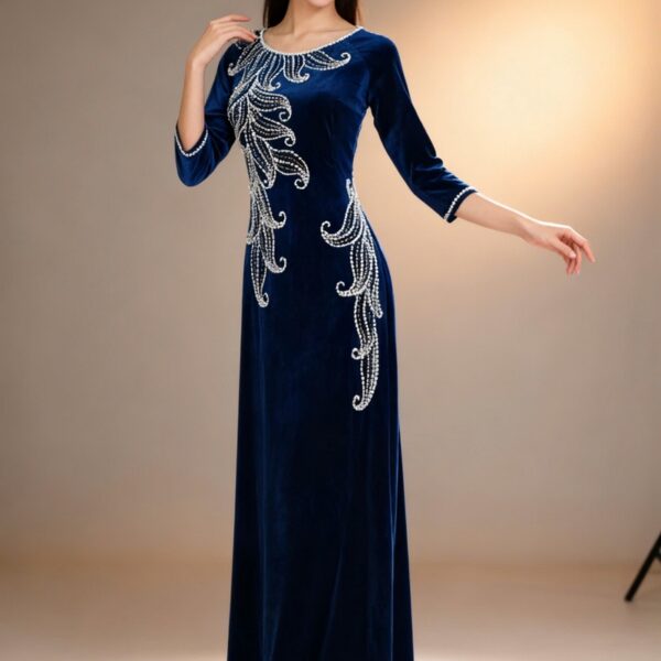 Điểm nhấn làm nên sự khác biệt của áo dài bà sui xanh nhung – XN239 chính là những họa tiết được đính kết thủ công một cách tỉ mỉ và tinh xảo.