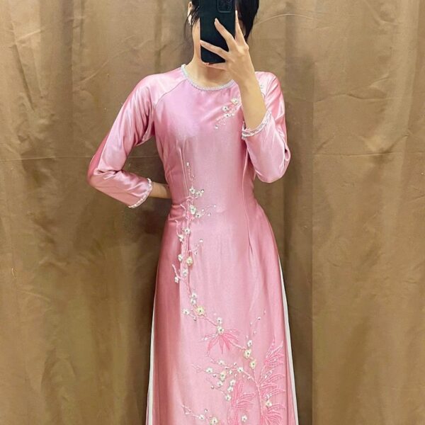 Áo dài bà sui hồng phấn lụa tây thi thêu- BSHT59
