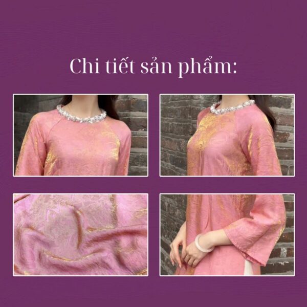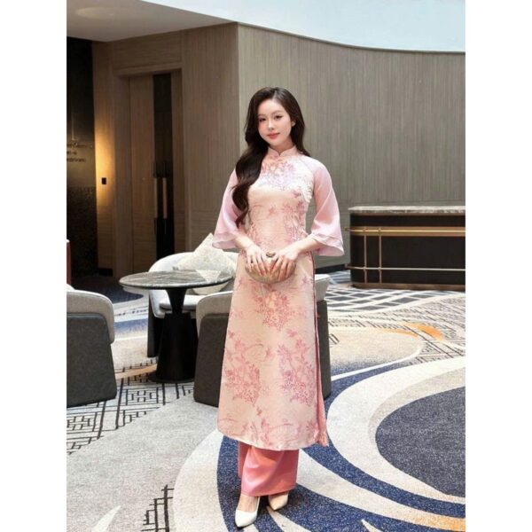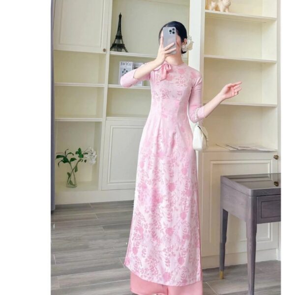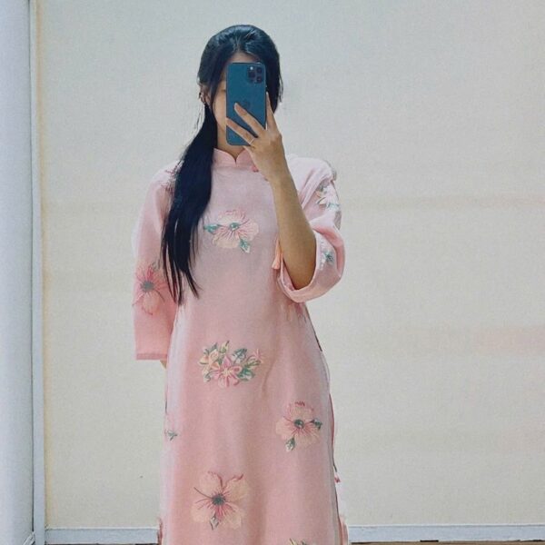 Áo dài chụp hình hoạ tiết hoa màu hồng