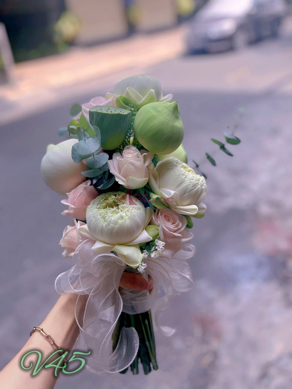 Bó hoa cưới đài sen bông sen trắng mix hoa hồng dâu V45