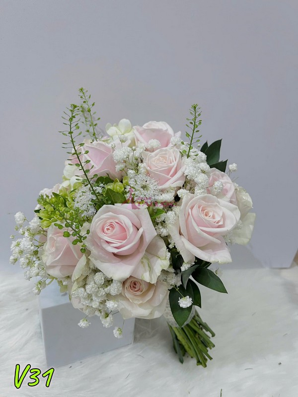 Mẫu hoa cưới cầm tay cô dâu bông hồng dâu V31 là sự hòa quyện tuyệt vời giữa sắc hồng pastel dịu ngọt của những đóa hoa bông hồng dâu và vẻ tinh khôi, thuần khiết của những bông bibi trắng nhỏ xinh. Bó hoa tựa như một áng mây bồng bềnh, mang đến cảm giác nhẹ nhàng, thanh thoát nhưng không kém phần sang trọng.