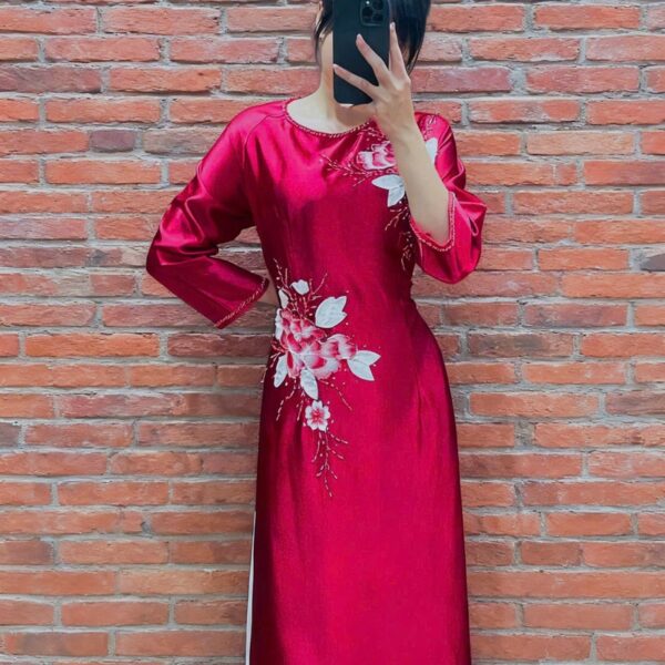 Áo dài bà sui đỏ lụa kết hoạ tiết trắng đơn giản- D143