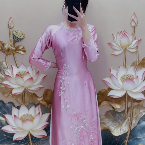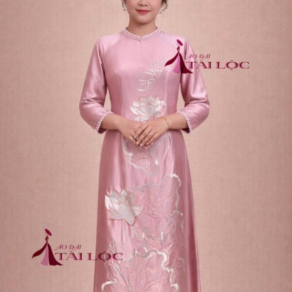 Áo dài bà sui hồng phấn lụa tây thi thêu- BSHT59