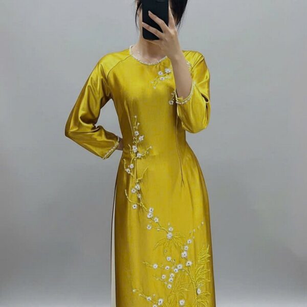 Áo dài bà sui màu vàng thêu hoa- V264