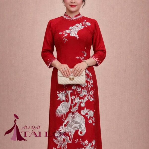 Áo dài bà sui đỏ lụa vẽ chim hạc cao cấp – D160